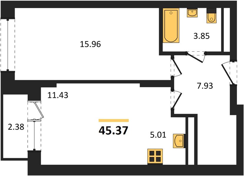 Квартира: 1 к 45,37 кв.м., 13 этаж в комплексе Ривер Парк 3, 3 очередь, корп.1, сдача: 1кв. , этажей: 24, адрес Екатеринбург г., Щербакова ул., д. 1, Застройщик: Призвание.