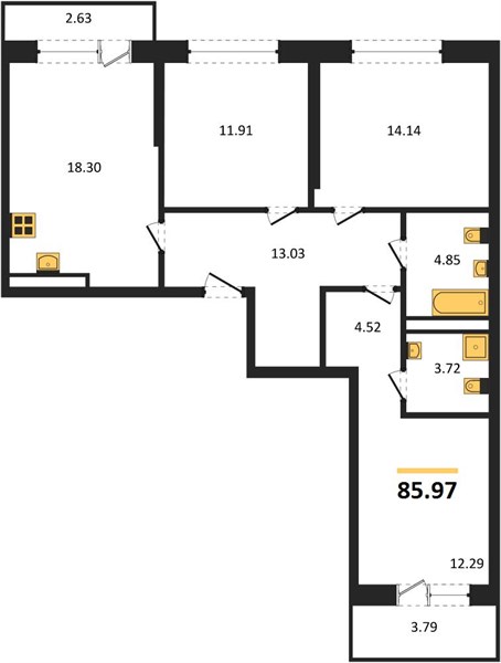 Квартира: 3 к 85,97 кв.м., 11 этаж в комплексе Ривер Парк 3, 3 очередь, корп.1, сдача: 1кв. , этажей: 24, адрес Екатеринбург г., Щербакова ул., д. 1, Застройщик: Призвание.