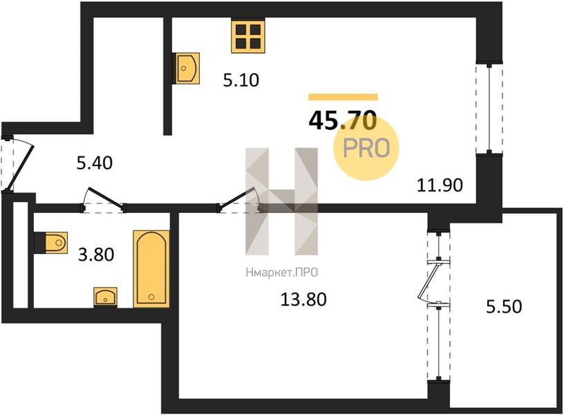 Квартира: 1 к 45,70 кв.м., 9 этаж в комплексе Южные Кварталы, 4 очередь, корп.4 (5-9 подъезд), сдача: 3кв. , этажей: 24, адрес Екатеринбург г., Шаумяна ул., , Застройщик: Брусника.