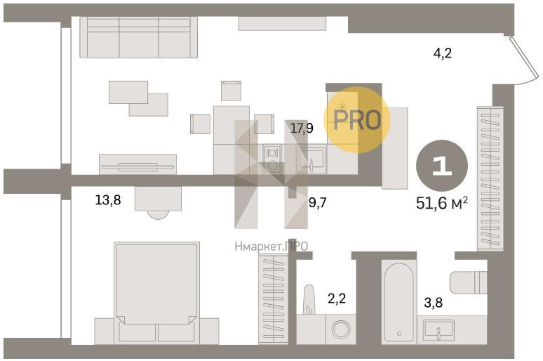 Квартира: 1 к 51,60 кв.м., 21 этаж в комплексе Южные Кварталы, 4 очередь, корп.4 (5-9 подъезд), сдача: 3кв. , этажей: 24, адрес Екатеринбург г., Шаумяна ул., , Застройщик: Брусника.