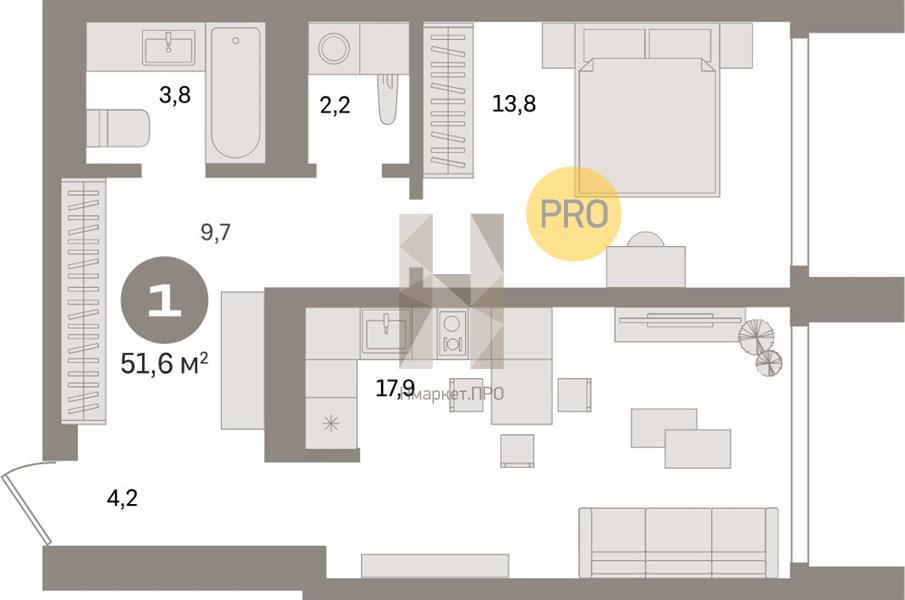 Квартира: 1 к 51,60 кв.м., 21 этаж в комплексе Южные Кварталы, 4 очередь, корп.4 (5-9 подъезд), сдача: 3кв. , этажей: 24, адрес Екатеринбург г., Шаумяна ул., , Застройщик: Брусника.