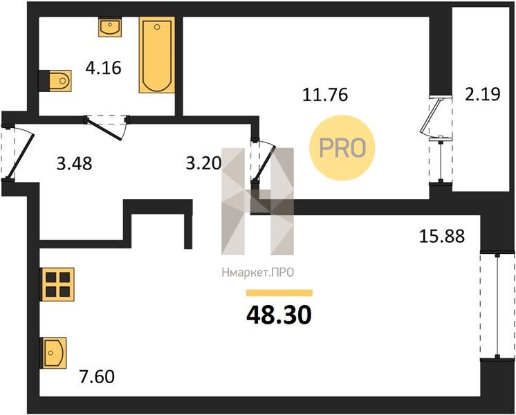 Квартира: 1 к 48,30 кв.м., 11 этаж в комплексе Южные Кварталы, 7 очередь, корп.11, сдача: 4кв. , этажей: 17, адрес Екатеринбург г., Шаумяна ул., д. 11, Застройщик: Брусника.