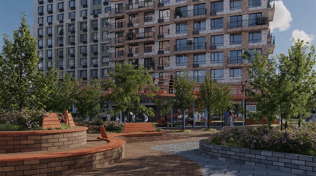 На двух гектарах земли разместился камерный жилой комплекс, где всего два дома, приватные дворы и паркинг для жителей. Прямо под окнами квартир расположилось зеленое полотно городской гостиной. За пределами комплекса она плавно переходит в Эльмашевский парк. Переменная этажность создает комфортную для человека среду, без давления высотных зданий. У каждого дома свой приватный двор окружен «зеленью», которая будет цвести весь год. В теплое время распускаются деревья, кустарники, цветы и травы. Зимой глаз будут радовать пушистые ели. Одной из значимых особенностей проекта станет муниципальный детский сад на 100 мест.