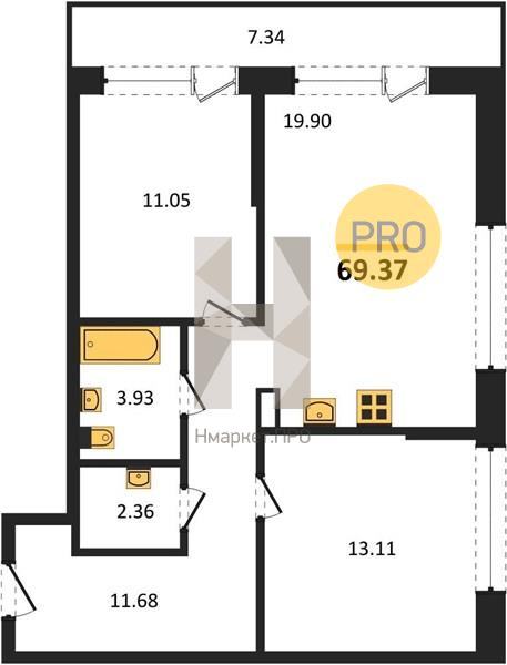 Квартира: 2 к 69,37 кв.м., 2 этаж в комплексе Страна.Энтузиастов, 1 очередь, корп." Энергия " секции 1-2, сдача: 4кв. , этажей: 24, адрес Екатеринбург г., Шефская ул., д. 22, Застройщик: Страна Девелопмент.