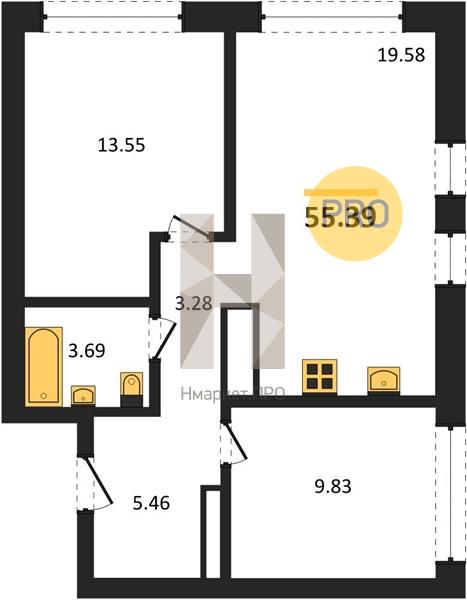 Квартира: 2 к 55,39 кв.м., 24 этаж в комплексе Премиум Кварталы Маяковка, 1 очередь, корп.1, сдача: 1кв. , этажей: 25, адрес Екатеринбург г., Сибирский тракт, д. 16, Застройщик: Деловой квартал.