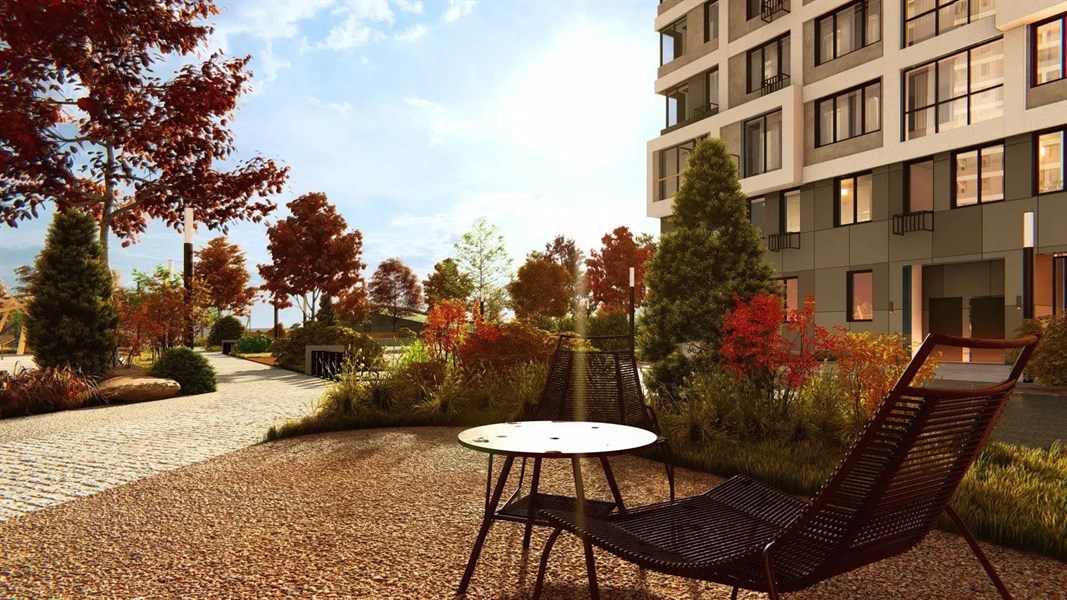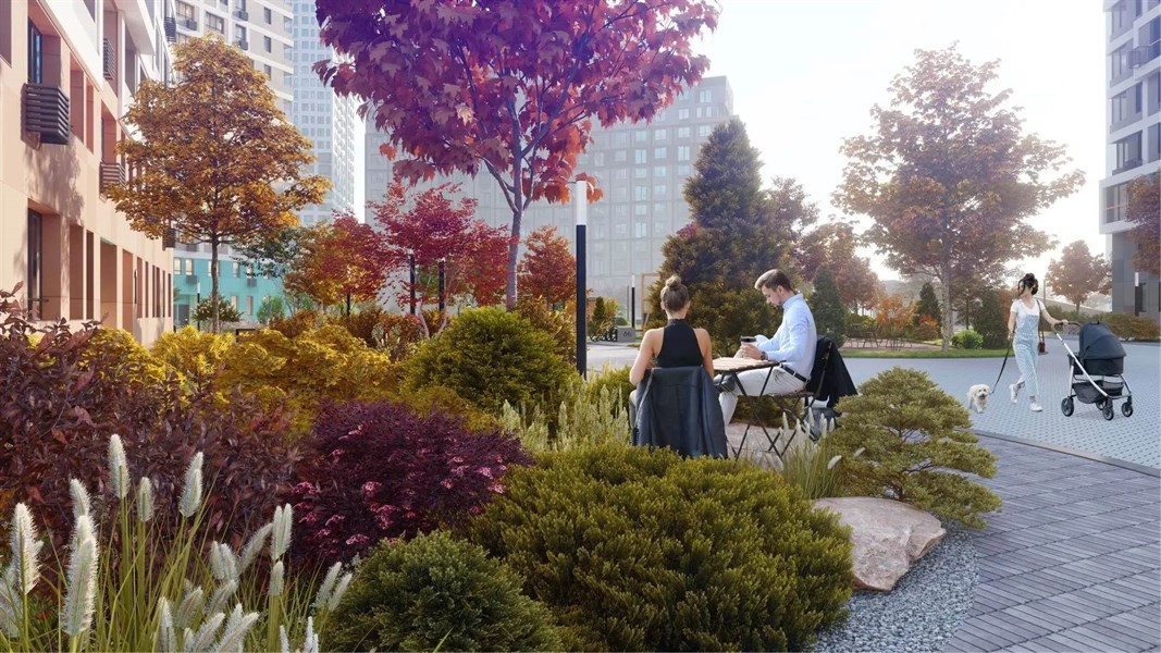 Дома выстроены в замкнутые кварталы. Во дворах высажены кустарники и взрослые многолетние деревья, создающие буфер между городской средой и приватным пространством двора. В центре комплекса расположена пешеходная аллея. Благодаря густому и насыщенному озеленению создается ощущение, что выходя из дома, попадаешь в парк. На пешеходном бульваре разместились детские площадки, воркаут-зоны, артобъекты и места для тихого отдыха. Двор-сад с приватной территорией без машин. Вход во двор по системе Face ID создает дополнительную безопасность.