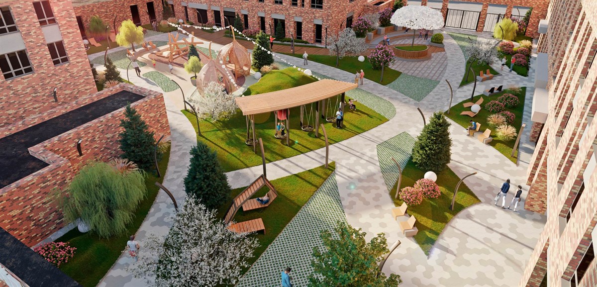 Для жителей квартала создано несколько озелененных дворов с детскими площадками для детей разных возрастов, workout-площадки, освещенные зоны отдыха и амфитеатр, магазины, салоны красоты. Предусмотрено наличие арт-объекта на территории двора.