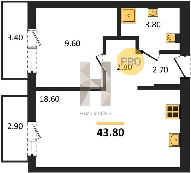 Купить 1-комнатную квартиру, 43.80 м2 № 6708365