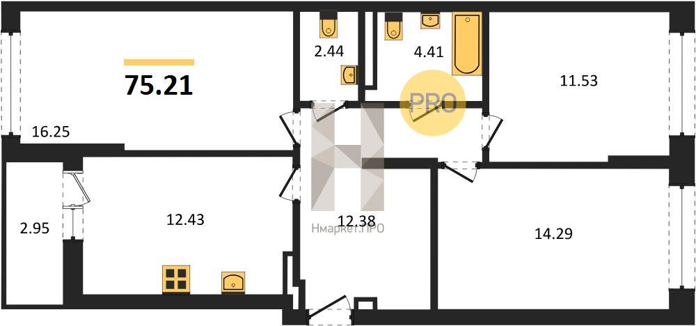 Квартира: 3 к 75,21 кв.м., 6 этаж в комплексе Мохито, 2 очередь, корп.3, сдача: 4кв. , этажей: 24, адрес Екатеринбург г., Тенистая ул., д. 24/3, Застройщик: Стройтэк.