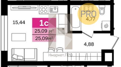 Студия: 25,09 кв.м., 6 этаж в комплексе Vitamin-квартал на Титова, 1 очередь, корп.1 (1,2,3 секции), сдача: 4кв. , этажей: 27, адрес Екатеринбург г., Титова ул., , Застройщик: СЗ Витамин Девелопмент.