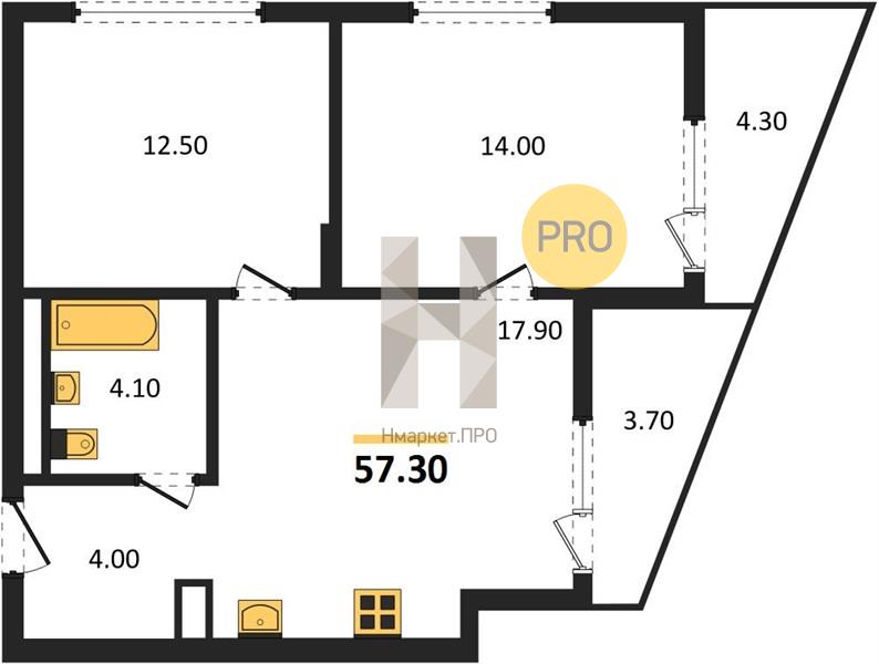 Квартира: 2 к 57,30 кв.м., 4 этаж в комплексе Малевич, 1 очередь, корп.6, сдача: 3кв. , этажей: 19, адрес Екатеринбург г., Трамвайный пер., д. 6, Застройщик: PRINZIP недвижимость.