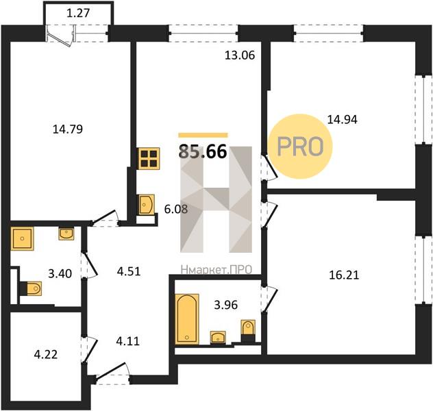 Квартира: 3 к 84,70 кв.м., 6 этаж в комплексе Квартал Ауруум, 1 очередь, корп.2, сдача: 4кв. , этажей: 24, адрес Екатеринбург г., Учителей ул., , Застройщик: ГК Самолет.
