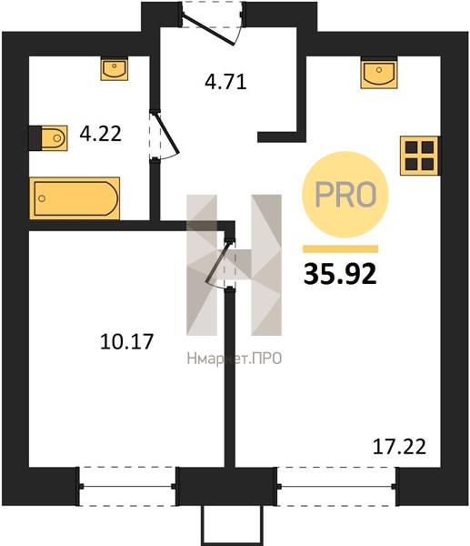 Квартира: 1 к 35,92 кв.м., 22 этаж в комплексе RAZUM на Малышева, 1 очередь, корп.1, сдача: 4кв. , этажей: 31, адрес Екатеринбург г., Вишнёвая ул., , Застройщик: РАЗУМ.