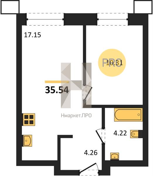 Квартира: 1 к 35,54 кв.м., 22 этаж в комплексе RAZUM на Малышева, 1 очередь, корп.1, сдача: 4кв. , этажей: 31, адрес Екатеринбург г., Вишнёвая ул., , Застройщик: РАЗУМ.