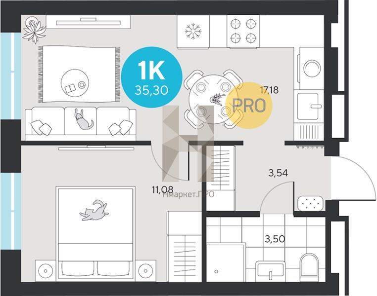 Купить 1-комнатную квартиру, 35.30 м2 № 7229707