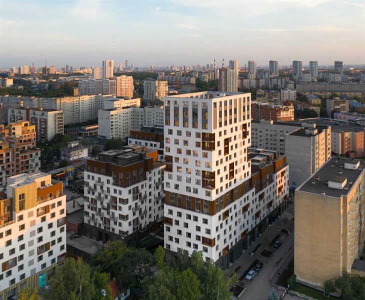 Жилой комплекс расположен в Орджоникидзевском районе в квадрате улиц Стачек, Войкова, Каширской и переулка Ритслянда. Он находится на тихой территории между крупными городскими магистралями: проспектом Космонавтов и улицей Старых Большевиков. Квартал состоит из многоэтажных домов с тремя башнями по периметру и шестью урбан-виллами внутри. Фасады, сочетающие светлую и темную штукатурку, акцентируют панели теплых оттенков «под дерево». Ритм зданий создается за счет чередования окон разных размеров, прогулочных террас и лоджий.