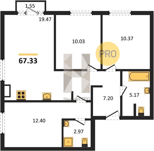 Квартира: 3 к 67,33 кв.м., 11 этаж в комплексе Progress Встречный, 1 очередь, корп.1 (секция 1), сдача: 1кв. , этажей: 24, адрес Екатеринбург г., Встречный пер., , Застройщик: Прогресс.