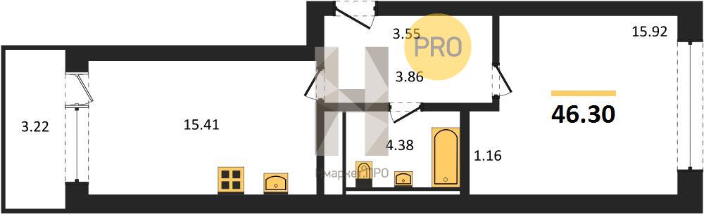 Квартира: 1 к 46,20 кв.м., 12 этаж в комплексе Солнечный, 3 очередь, корп.5.4 (1 корпус), сдача: 3кв. , этажей: 16, адрес Екатеринбург г., Вдохновения бул., д. 4, Застройщик: ГК ЭТАЛОН.